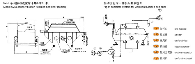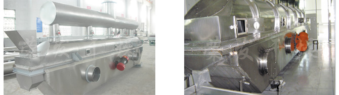 物料自進料進口進入機內,在振動力作用下,物料沿水平面流化床拋擲,向前連續運動,熱風向上穿過流化床同濕物料換熱后,濕空氣經旋風分離器除塵后由排風1:3排出.干燥物料由排料進口排出。